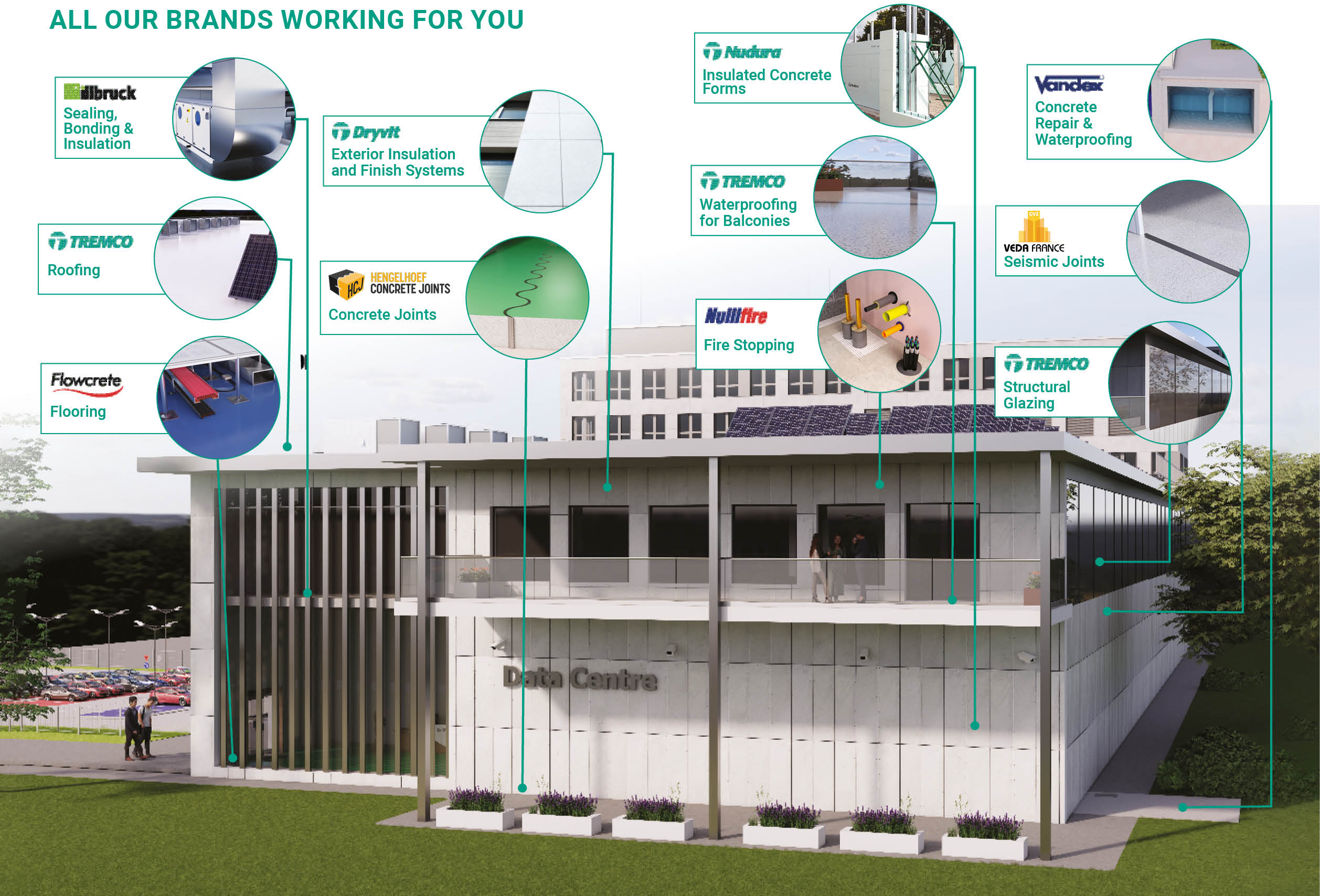 Through our specialist brands, Tremco CPG provides proven solutions across fire protection, sealing and bonding, flooring and ESD control, waterproofing, roofing, façade systems, and structural technologies. Together, these integrated systems help ensure the safety, sustainability, and long-term performance of data centre infrastructure throughout its operational lifecycle.