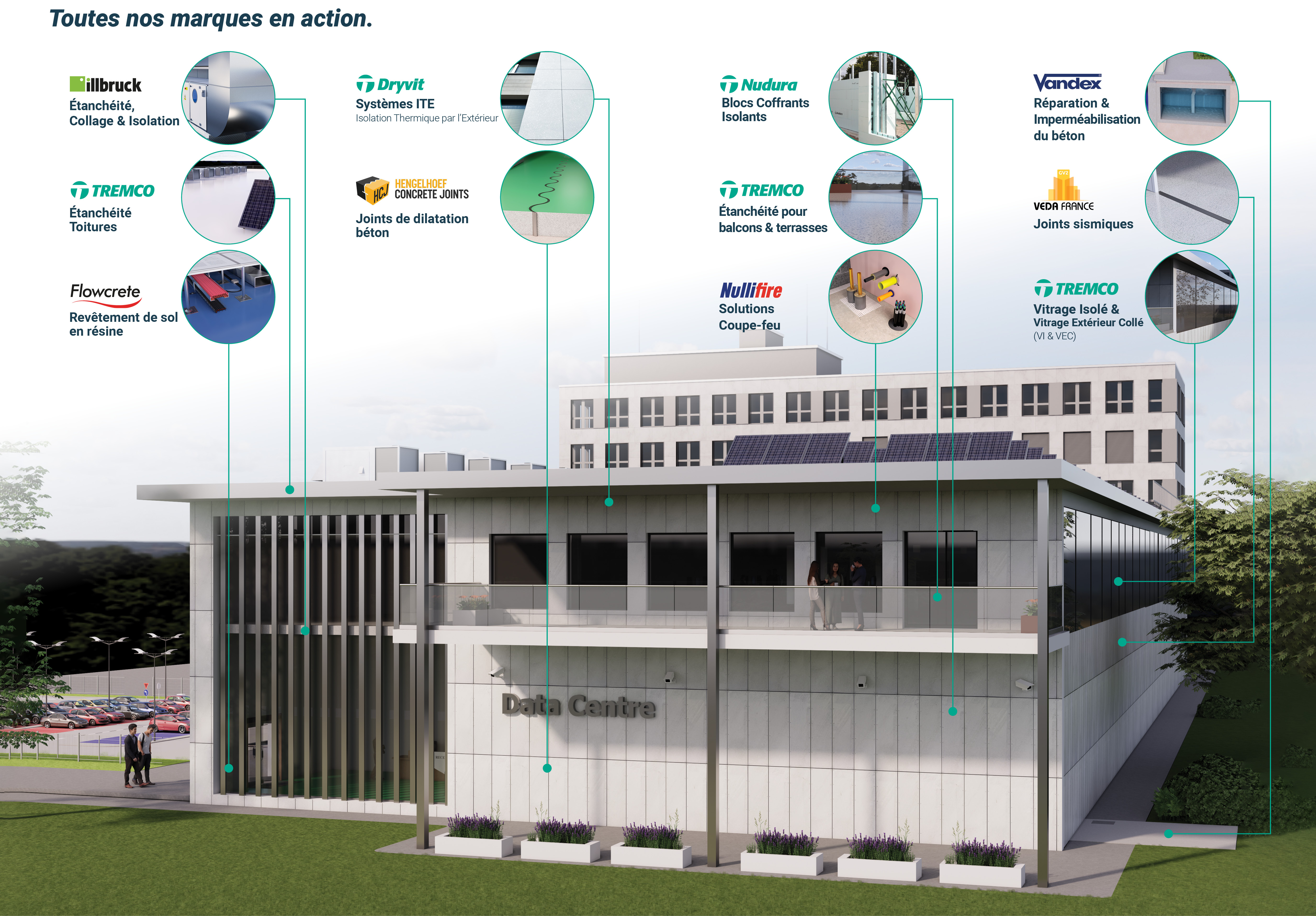 Tremco CPG France propose une offre complète de solutions intégrées couvrant tous les besoins de la construction et de la maintenance des data centres, du sol à la toiture. Nos marques expertes – Nullifire, illbruck, Flowcrete, Vandex, Dryvit, Nudura et VEDA France – assurent la performance et la durabilité de vos infrastructures.