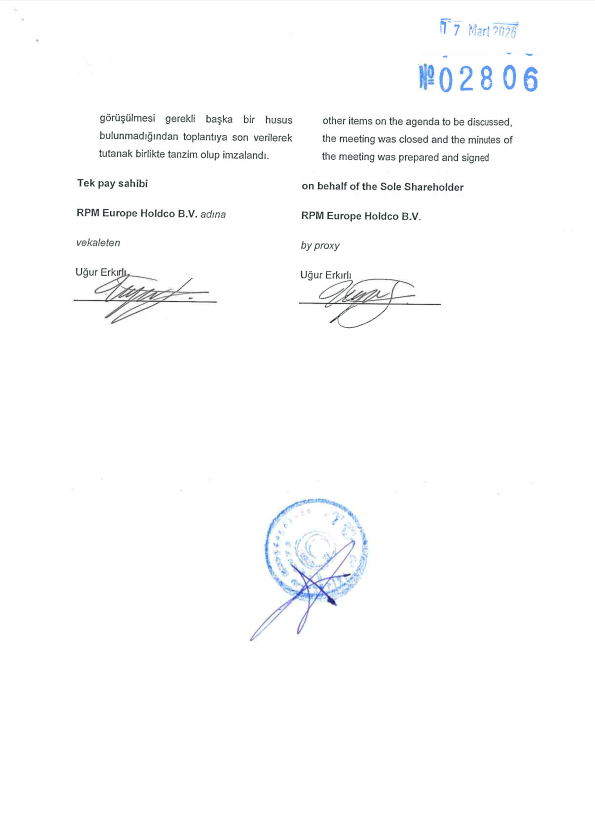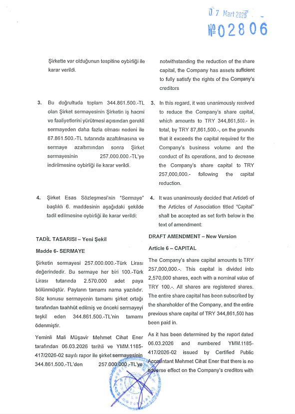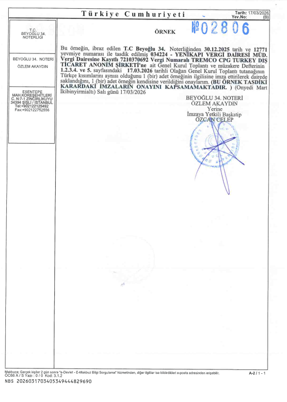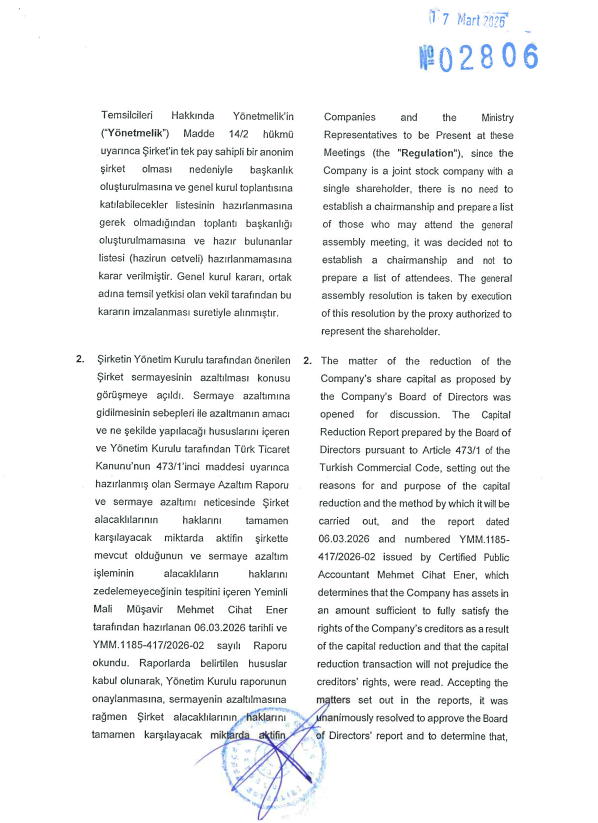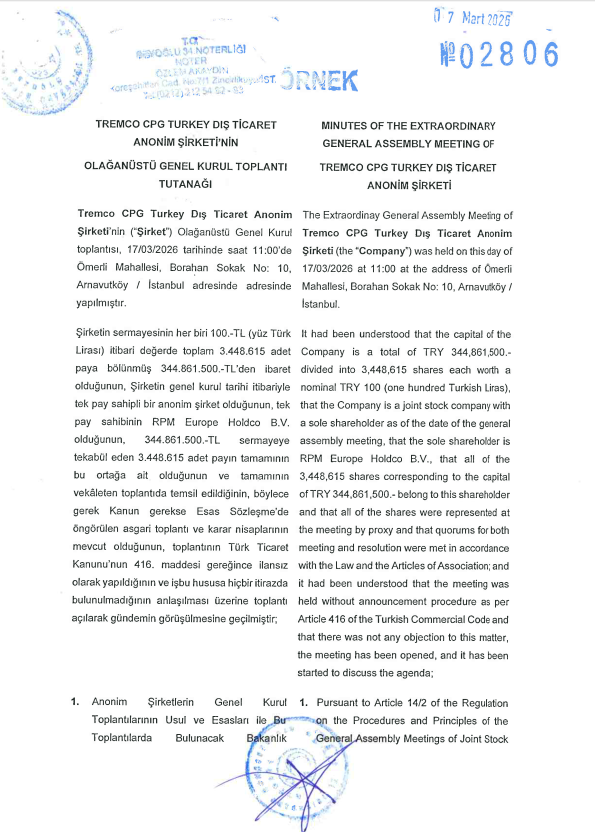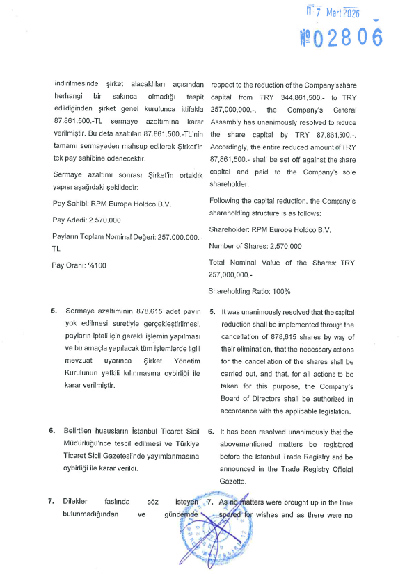 Raporun konusu: Türk Ticaret Kanunu'nun 473, 474 ve 475. maddeleri gereği, Tremco CPG Turkey Dış Ticaret Anonim Şirketi'nin Esas Sermayesinin Azaltılması işlemi hakkında Yönetim Kurulu raporudur.